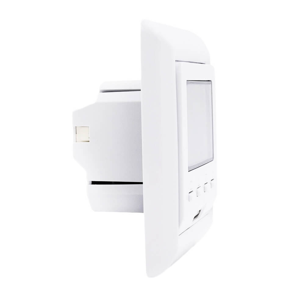 Настенный врезной терморегулятор применяется в системах теплого пола. Прибор оснащен встроенным терморезистором для измерения температуры в месте установки и дополнительным датчиком температуры, который монтируется непосредственно в пол на расстоянии не более трех метров от терморегулятора. Диапазон измерения и регулирования температуры – от 5 до 90 градусов с шагом от 0.5 до 10 градусов. Реле терморегулятора рассчитано на коммутацию нагрузки до 3520 Вт.