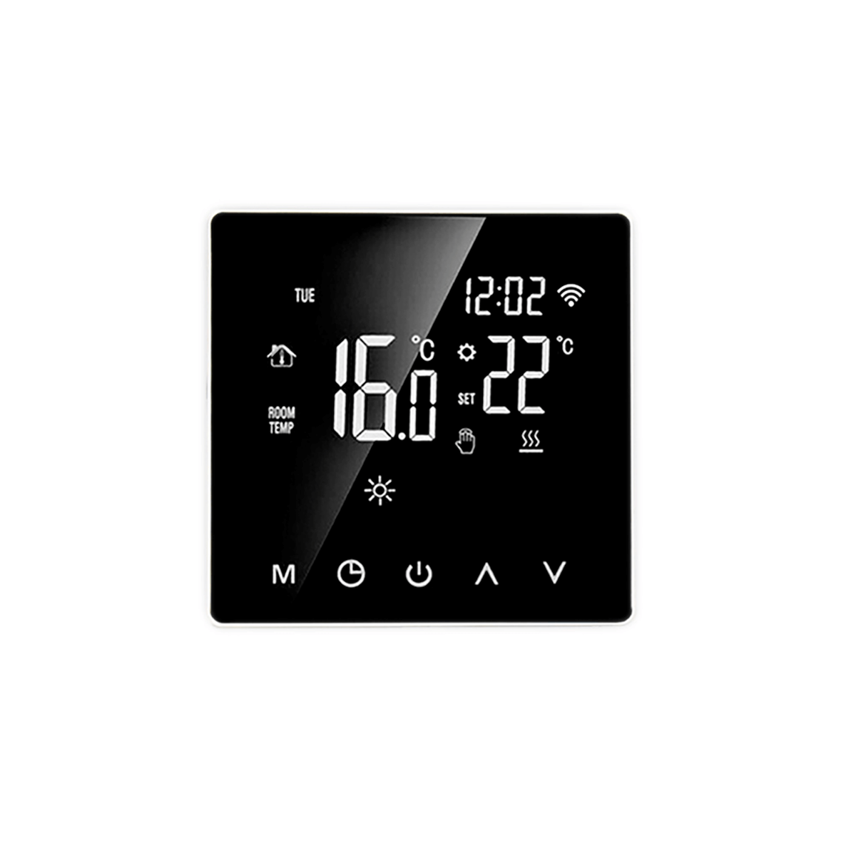 • Элегантный внешний вид и современный дизайн термостата отлично впишутся в любое помещение: дом, офис, отель, торговый центр. Комнатный регулятор имеет большой информативный жидкокристаллический зеркальный экран с сенсорным управлением и защитой от царапин. Дисплей оснащен сенсорными кнопками с оранжевой подсветкой для упрощения работы. При необходимости подсветку можно отключить.